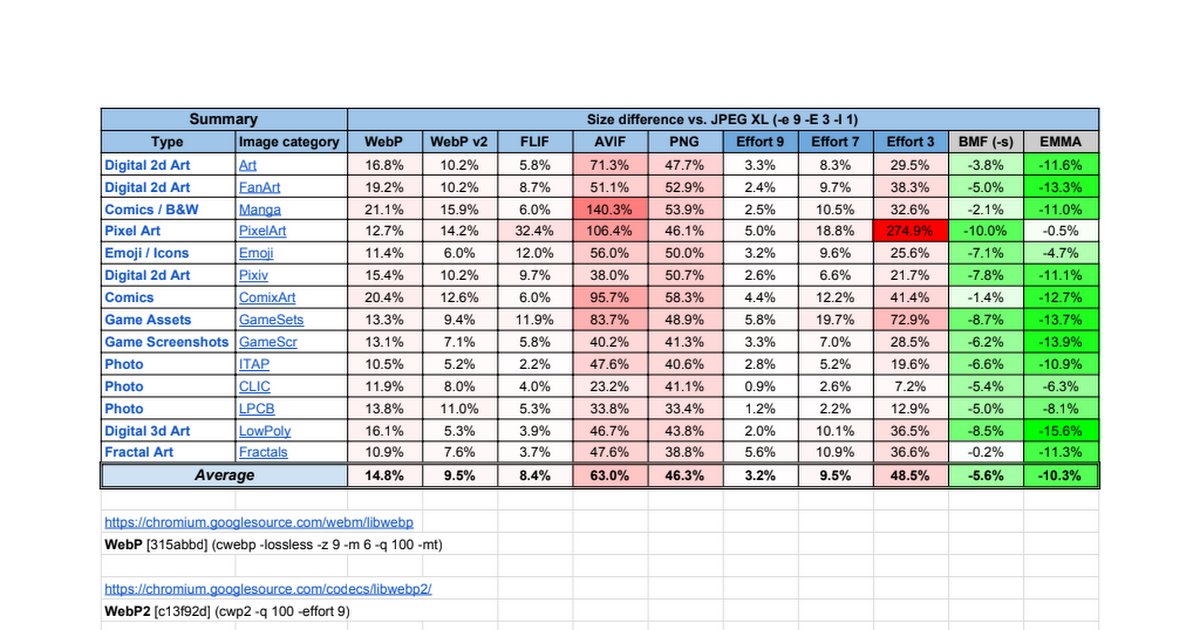 Details Summary,Size difference vs. JPEG XL (-e 9 -E 3 -I 1) Type,Image category,WebP,WebP v2,FLIF,AVIF,PNG,Effort 9,Effort 7,Effort 3,BMF (-s),EMMA Digital 2d Art,Art,16.8%,10.2%,5.8%,71.3%,47.7%,...